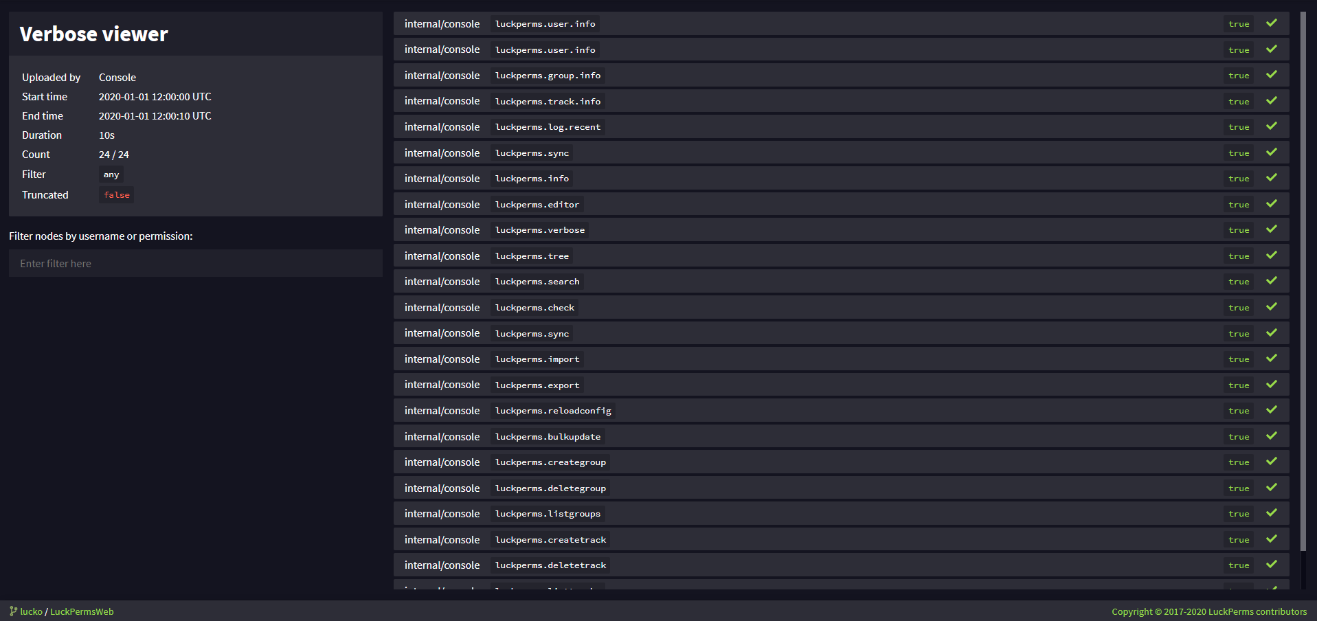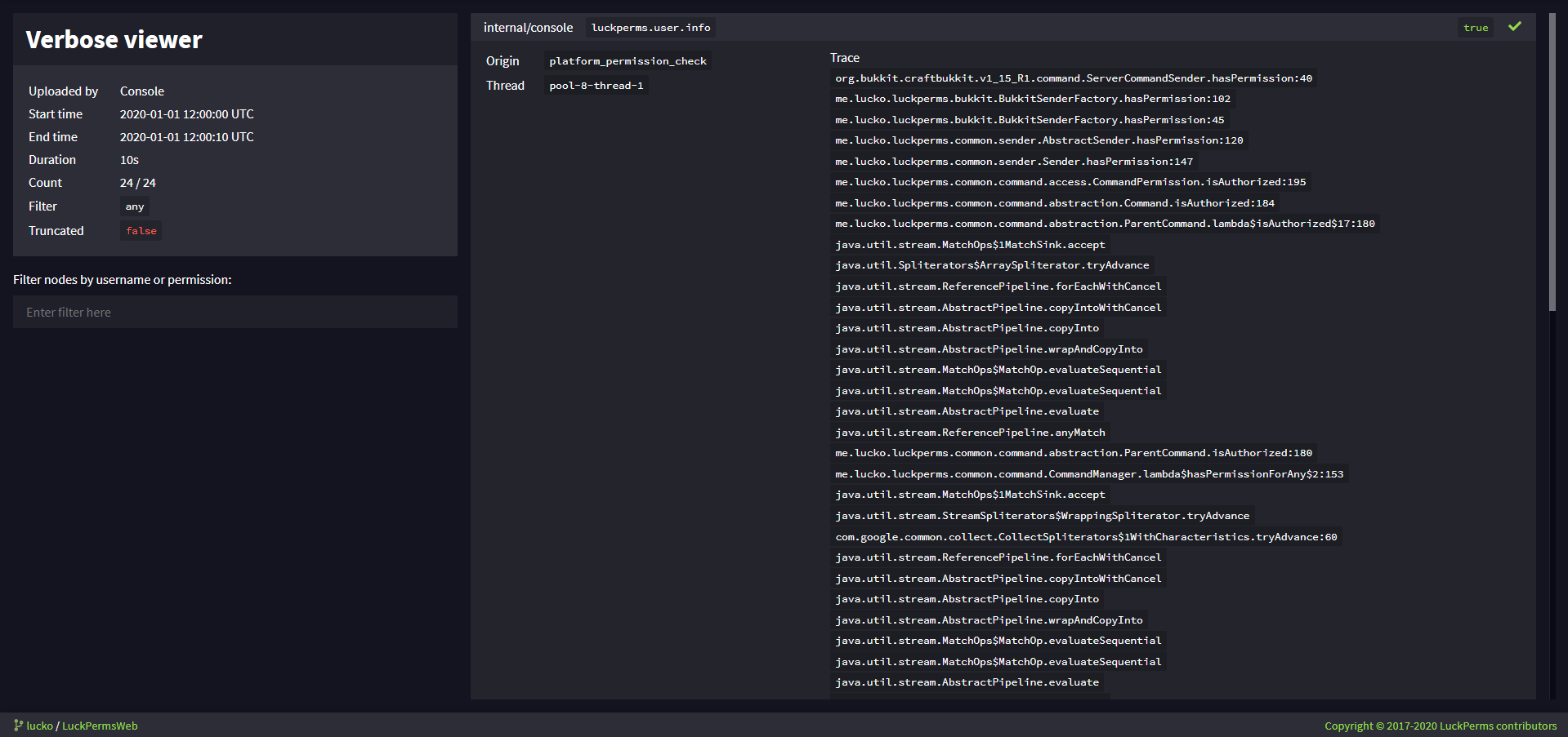 If your client lags when you run /lp verbose on, it is likely because there are too many permission checks being processed and the client can't handle that many messages. It is often best to run lp verbose record instead. The record command will send the permission checks to the web-based verbose viewer, instead of to your client as a chat message. To finish recording permission checks and open the web viewer, simply run lp verbose upload.