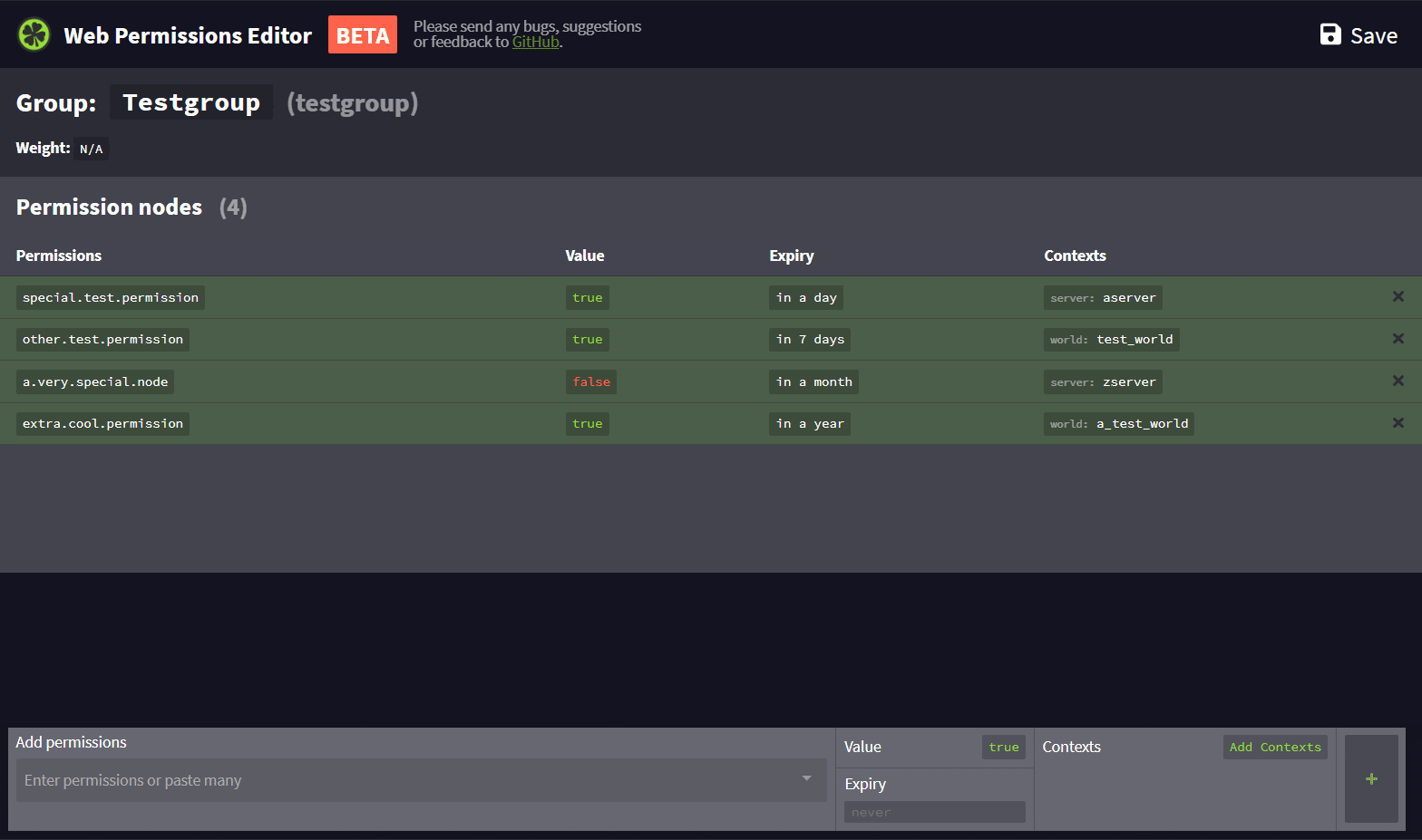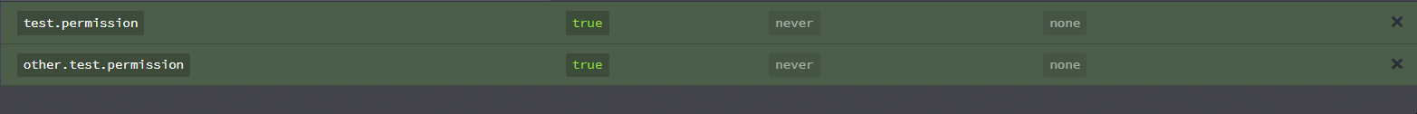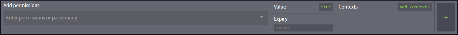 To add a permission, type the node you'd like to add into the "Add Permission" input box and press enter. You can repeat this for all permissions that you want to add with the same properties.